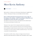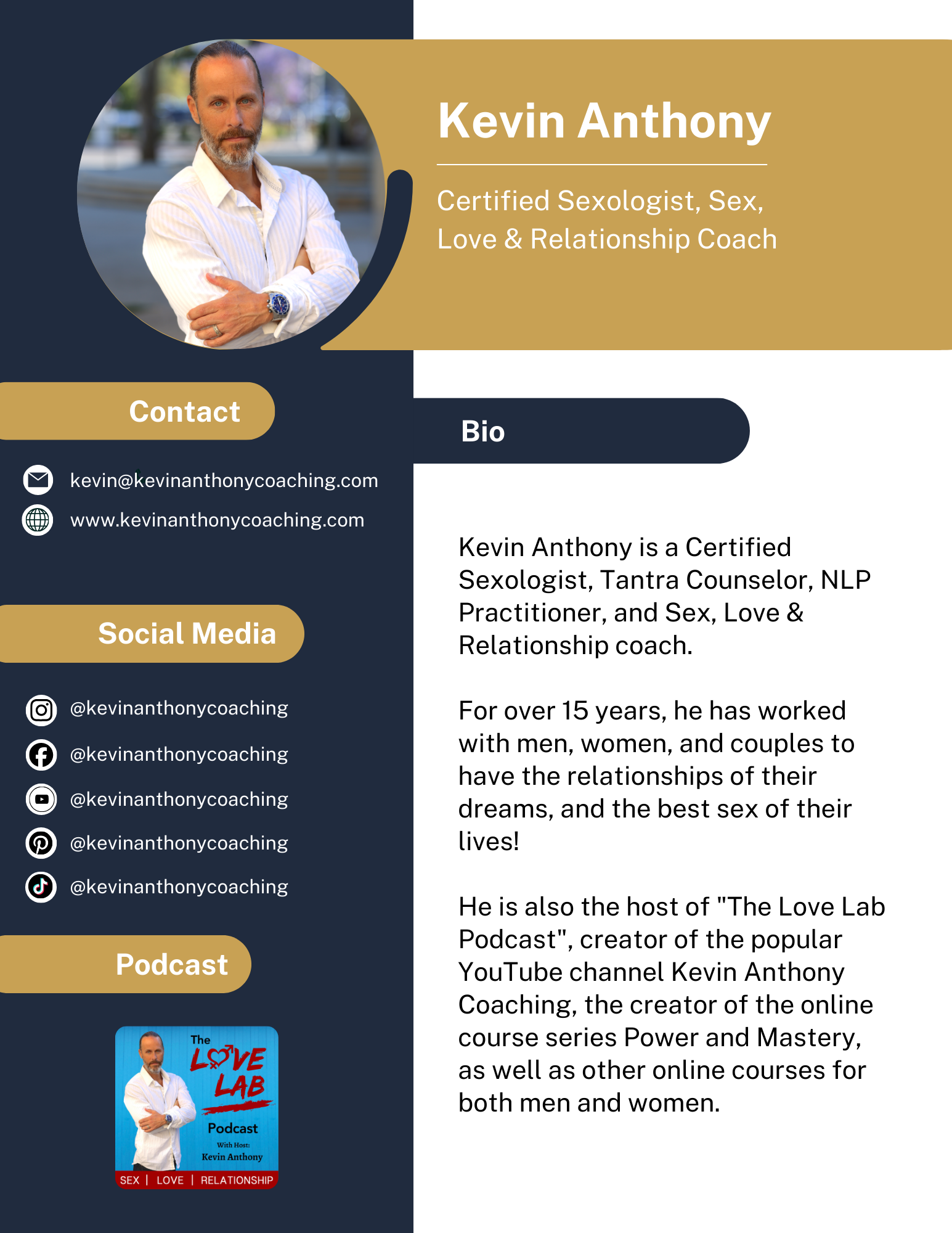 He is also the host of “The Love Lab Podcast,” creator of the popular YouTube channel Kevin Anthony Coaching, and the co-creator of the online course series “Power and Mastery”, as well as other online courses and products.