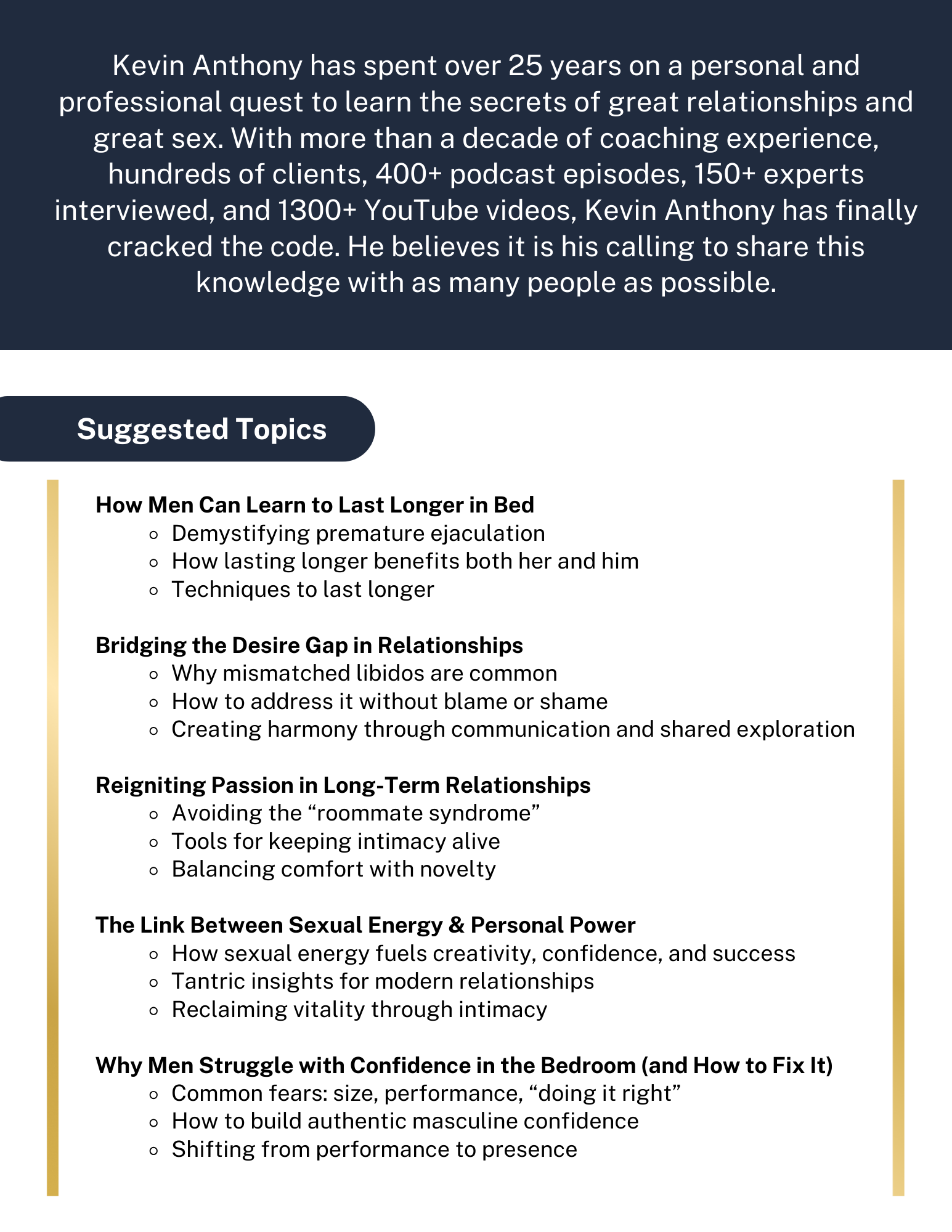 Kevin Anthony has spent over 20 years on a personal and professional quest to learn the secrets of great relationships and great sex. With more than a decade of coaching experience, hundreds of clients, 370+ podcast episodes, 150+ experts interviewed, 1000+ YouTube videos, Kevin Anthony has finally cracked the code. He believes it is his calling to share this knowledge with as many people as possible.